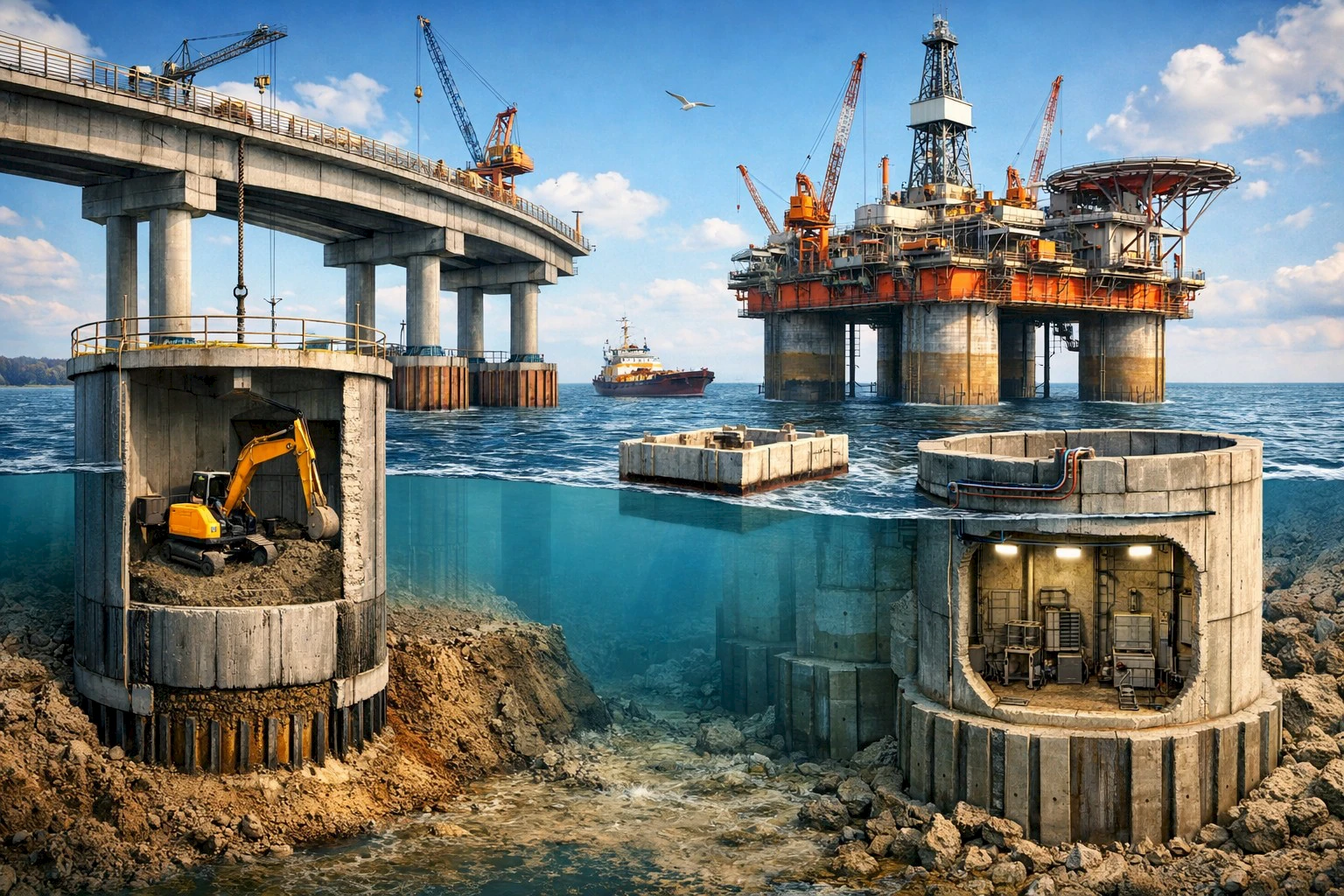 A caisson foundation is a large, hollow structure, usually made of concrete or steel, that is sunk into soil or underwater to support heavy structures such as bridges and piers. Soil is removed from inside so it sinks to firm ground, then concrete is poured, creating a strong, stable base in challenging conditions.