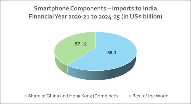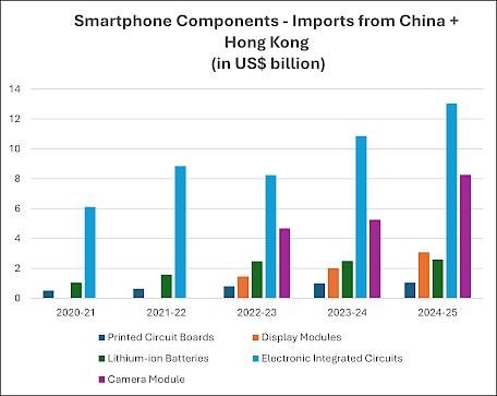Exports to China include iron ore, shrimp and other marine products, castor oil, spices, organic chemicals, and electrical machinery. Imports from China consist largely of machinery, electronic goods, personal computers, integrated circuits, telephonic/telegraphic equipment parts, components for solar power and other renewable energy systems, plastics, pharmaceutical intermediaries, auto components, lithium-ion batteries, fertilisers, and organic chemicals. While the import basket heavily outweighs exports, it is notable that the bulk of imports from China comprises components, raw materials, and intermediate goods. Chinese suppliers have long provided convenience and ease of doing business for Indian industry. Therefore, any disruption in these supply lines can considerably hinder operations, forcing Indian industry to seek less convenient options. A major share of these components and intermediate goods falls within the electronics sector, classified under HS Code 85 in the global trade and shipments ecosystem. Figure 1 and Figure 2 below present a subset of this sector—smartphone components—imported from China and Hong Kong between FY 2020–21 and FY 2024–25. Figure 1 shows that all five major components critical to smartphone production are sourced from mainland China and Hong Kong.