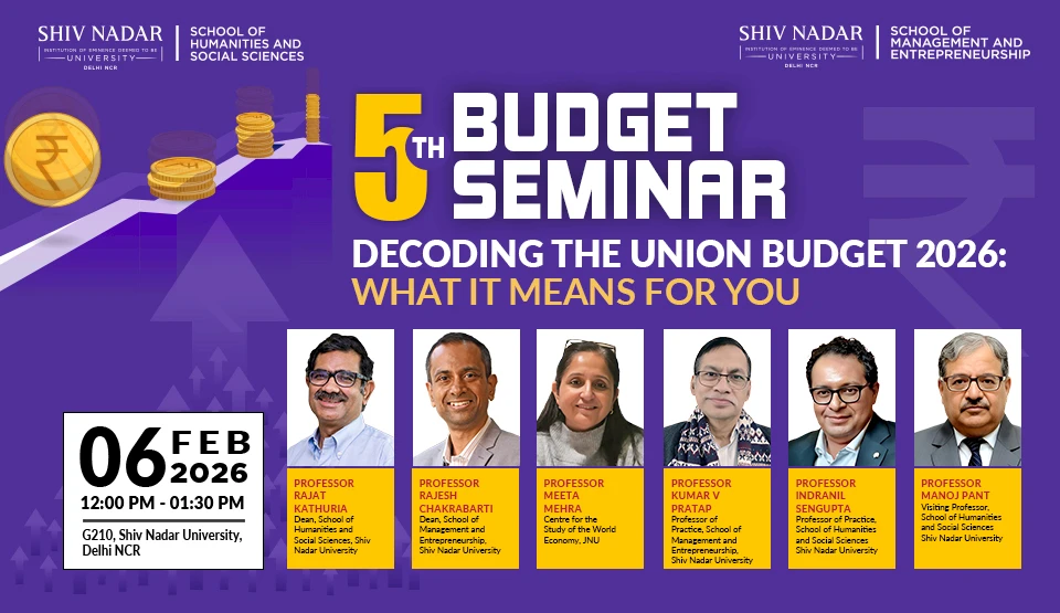 The 5th Budget Seminar: Decoding the Union Budget 2026, scheduled to be held on Friday, 6 February 2026, from 12:00 PM to 1:30 PM at G210. The event is jointly hosted by the School of Humanities and Social Sciences (SHSS) and the School of Management & Entrepreneurship (SME).