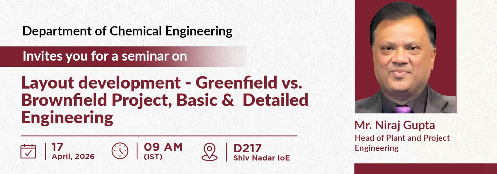 Niraj Gupta is based at New Delhi, worked as Head of Plant and Project Engineering. He has worked over the last 34 years in Plant Engineering and Process Design for Oil & Gas downstream, Petrochemicals and Specialty Chemicals Projects with various Chemical Manufacturing, Engineering and Consultancies companies like L&T, Jacobs Engg., Simon Carves, Jubilant and Aditya Birla Chemicals with a proven track record in Design & Engineering, EPC/EPCM Project Engineering & Management of Greenfield and Brownfield Projects in India & Gulf countries. He is adept at steering large-scale Chemical and Petrochemical Projects from concept to commissioning including Plant design, Process and Piping Engineering, Authority Engineering, Residual Engineering and Technology Integration. He is recognized for delivering on time projects and driving project engineering budget control with a focus on technical depth, compliance and cost efficiency. He completed his Chemical Engineering Degree from Amrawati University and holds PGDBA.