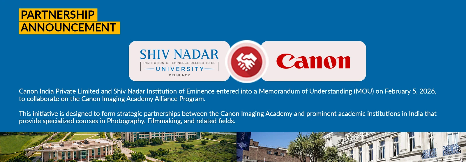 On February 5, 2026, CANON INDIA PRIVATE LIMITED and the Shiv Nadar Institution of Eminence formalized their collaboration through a Memorandum of Understanding (MOU) to launch the Canon Imaging Academy Alliance Program. This initiative aims to establish strategic partnerships between the Canon Imaging Academy and leading academic institutions across India that offer specialized programs in Photography, Filmmaking, and related disciplines.