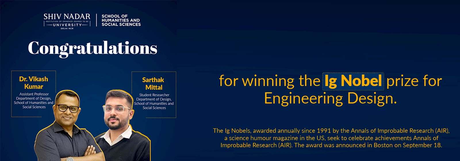 Dr. Vikash Kumar , Assistant Professor of Design at Shiv Nadar University , and student researcher Sarthak Mittal have been awarded the Ig Nobel Prize for Engineering Design. Their project, which began as a student assignment, involved creating shoe racks equipped with ultraviolet lamps to combat unpleasant odors caused by bacteria in shoes often left outside hostel rooms.