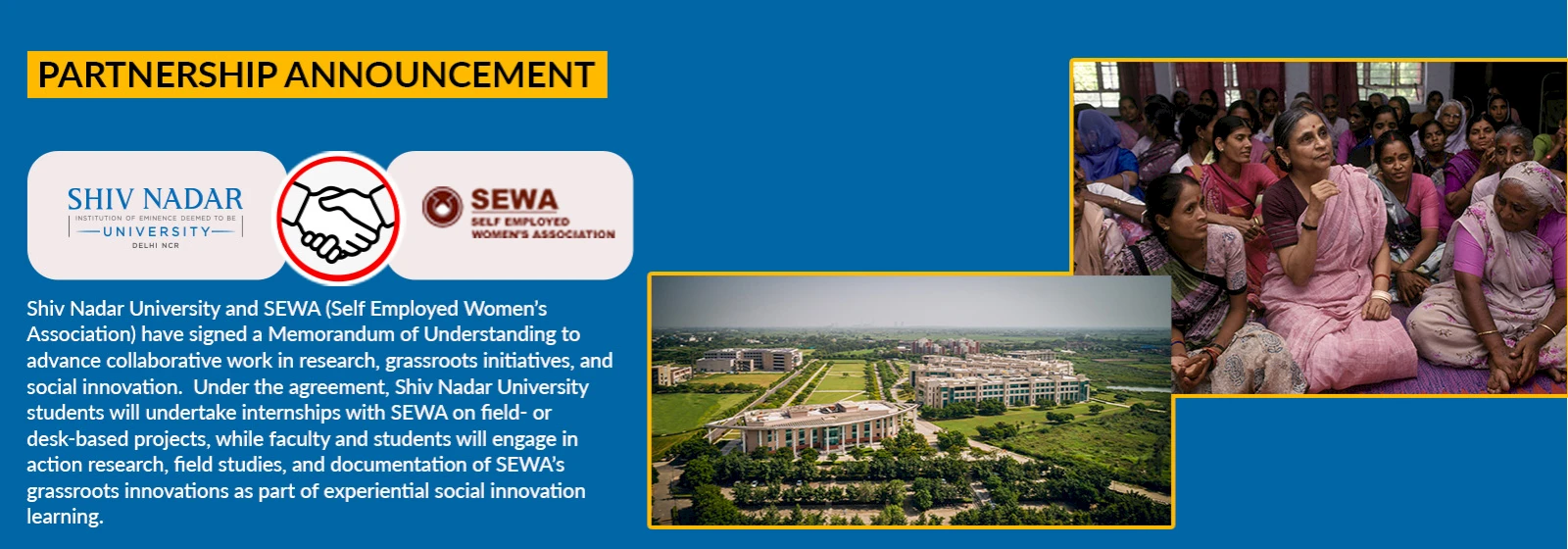 Shiv Nadar University and SEWA (Self Employed Women’s Association) have signed a Memorandum of Understanding (MoU) to advance collaborative work in research, grassroots initiatives, and social innovation. Under this agreement, SNIoE students will undertake internships with SEWA on field- or desk-based projects, while faculty and students will engage in action research, field studies, and documentation of SEWA’s grassroots innovations as part of experiential social innovation learning.