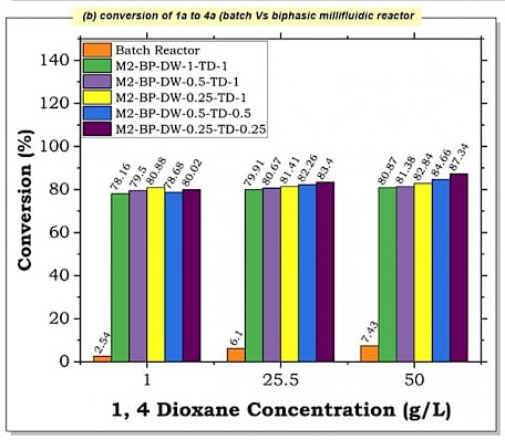 Process intensification was investigated using Design of Experiments (DoE) and Generalized Linear Modeling (GLM), identifying favorable operating conditions (TF = 0.246 mL/min, FR = 0.2, LED = 100%, [dioxane] = 25.5 g/L, M2 channel), predicting 100% conversion. Experimental trials achieved up to 93% conversion in S3 geometry, exceeding the performance of M2 under comparable conditions. Synergistic non-linear parameter interactions among flow rate, light intensity and reactor geometry were identified through statistical analysis.